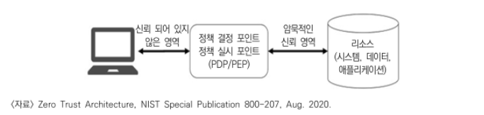 - 기본 원칙: 모든 종류의 접근에 대해 신뢰하지 않을 것 (명시적인 신뢰 확인 후 리소스 접근 허용)