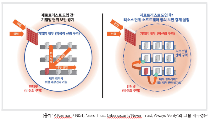 - 전통적인 보안 모델은 경계를 중심으로 설계되었지만, 클라우드 서비스와 모바일 기기의 사용 증가로 내부 네트워크와 외부 네트워크의 경계가 모호해지면서 새로운 접근 방식이 필요하게 되었다.
