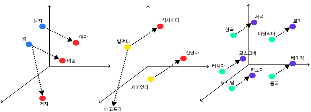 - 이 벡터들은 단어들의 '위치'를 나타내는데, 비슷한 의미를 가진 단어들은 벡터 공간에서 가까운 곳에 위치하게 돼요.