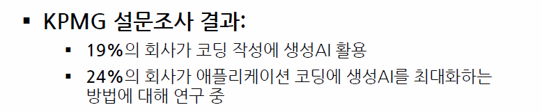 KPMG의 설문 조사 결과에 따르면, 이미 상당수의 기업이 코딩 작성에 AI를 활용하고 있으며, 더 많은 기업들이 AI를 통해 효율성을 높이려고 노력하고 있다. 이러한 변화는 개발 과정에 AI가 어떻게 사용되고 인간의 역할을 대체할지에 대한 중요한 통찰을 제공한다.