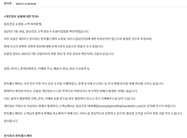 2025.7.15 한독헬스케어의 건강기능식품 쇼핑몰 ‘일상건강’ 개인정보 유출