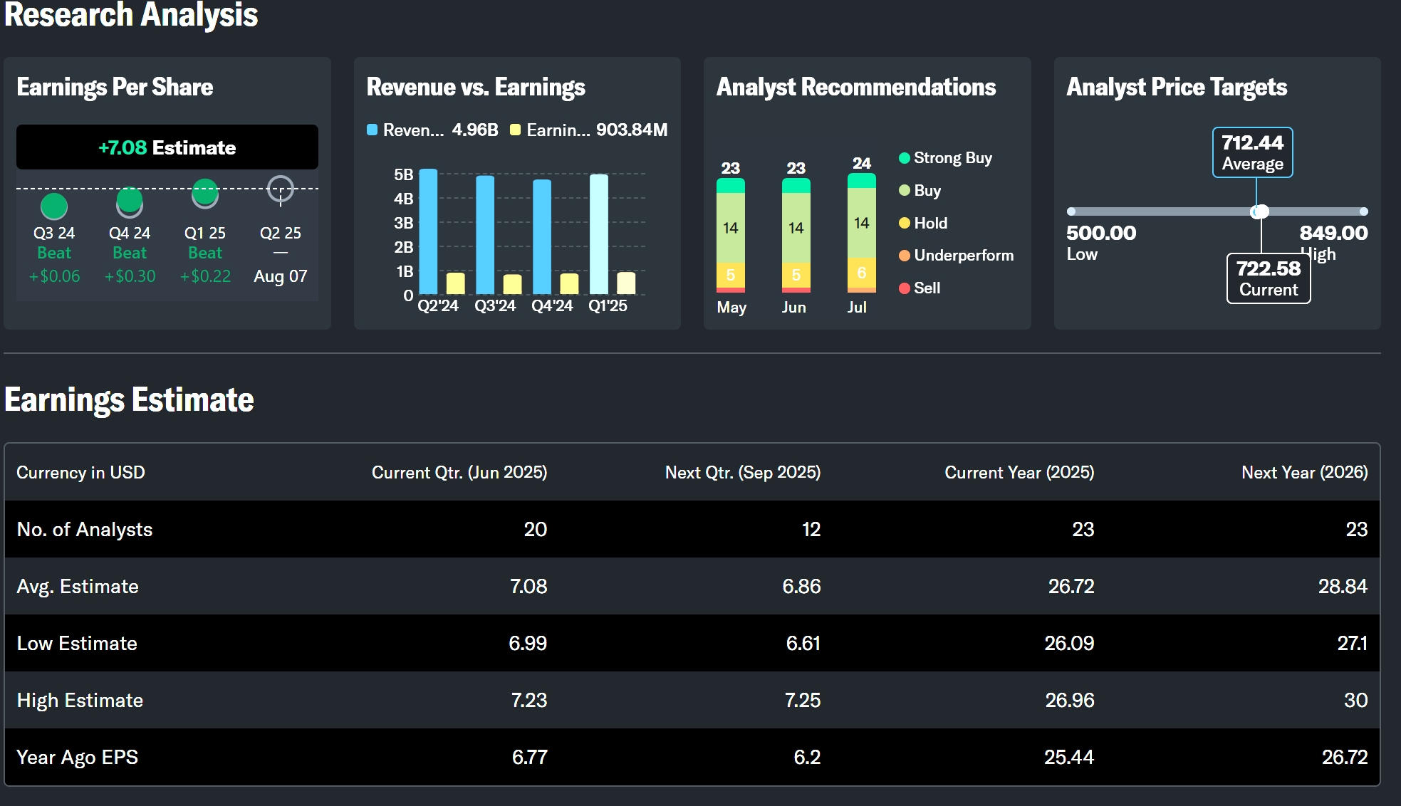 장기 투자: 우수한 배당 성장, 견고한 실적, 항공우주 등 구조적 성장동력 확보로 중장기적으로 우상향 기대. 급격한 시장 조정이 나온다면 $670 이하 매수도 좋은 전략.