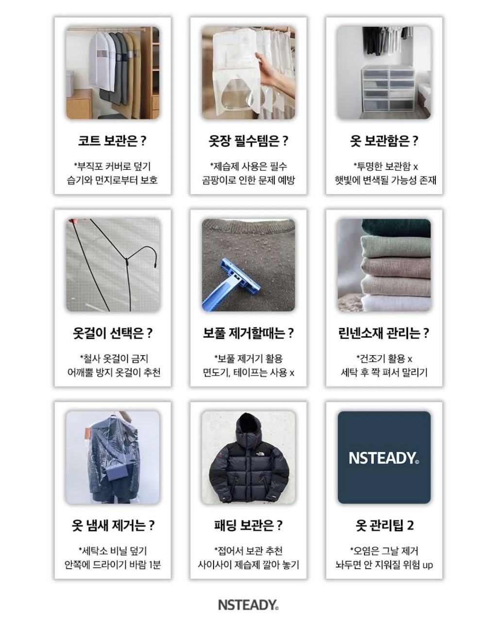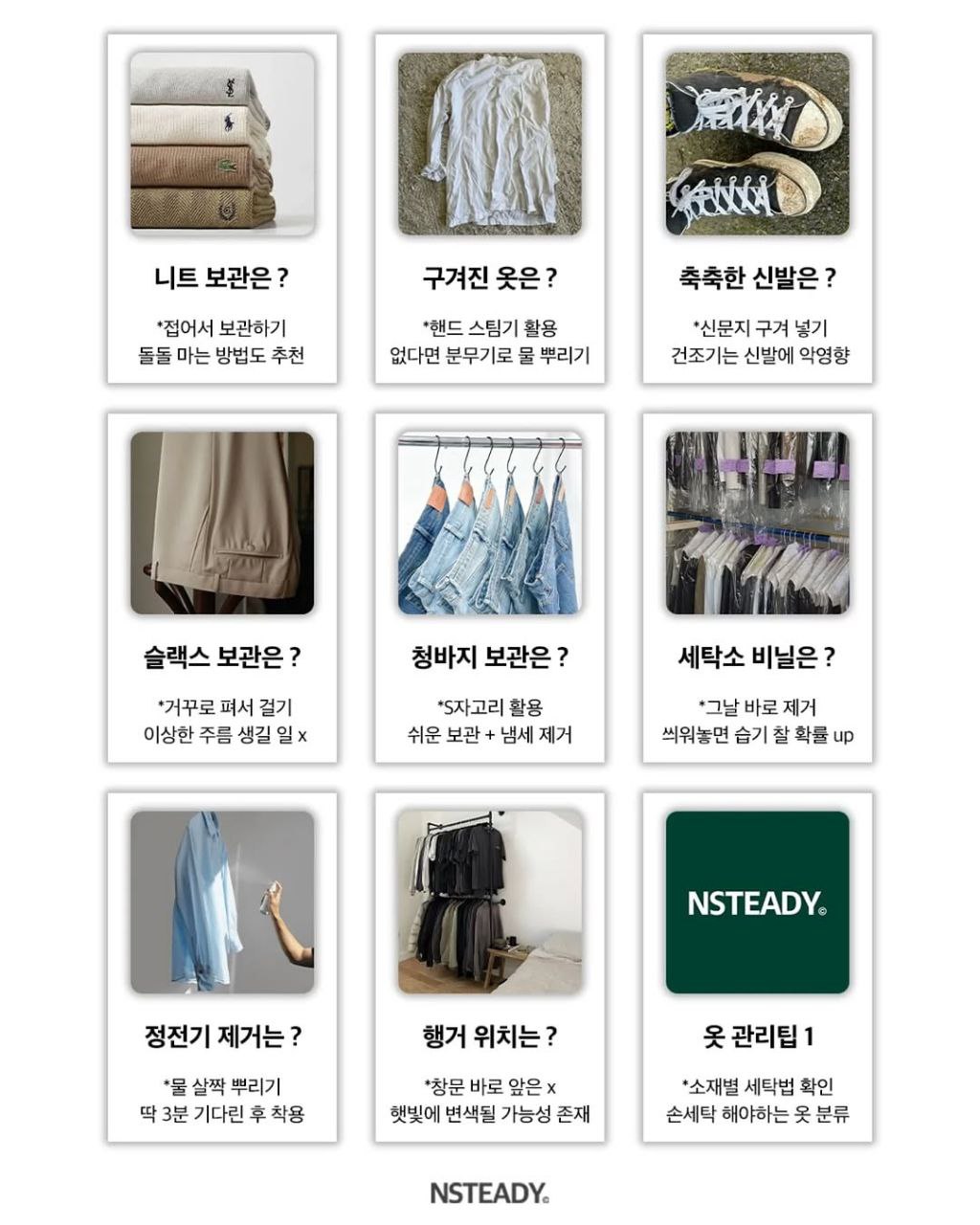 - 뒤집어서 펴서 걸어두면 이상한 주름이 생기는 것을 방지할 수 있습니다.