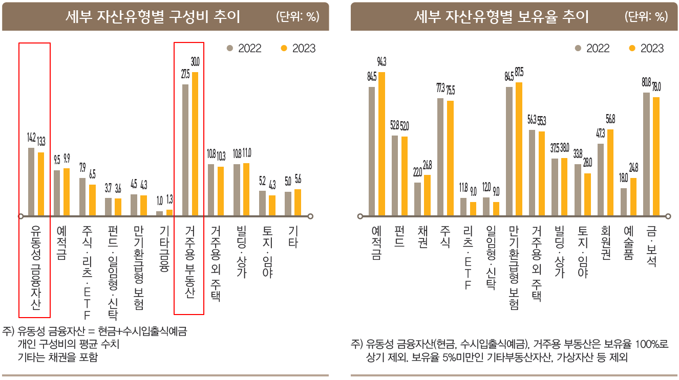 2023년은 부동산이 하락 조정을 받았음에도 비율이 증가한 이유는 금융자산 감소 대비 상대적으로 선방하고 자금을 안전자산으로 이동한 영향으로 보인다.