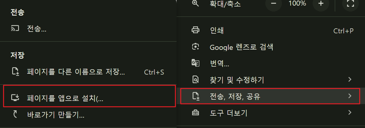 - 사이트 접속하기 -> 크롬 오른쪽 최상단 점 3개 클릭 -> 전송, 저장, 공유 -> 페이지를 앱으로 설치