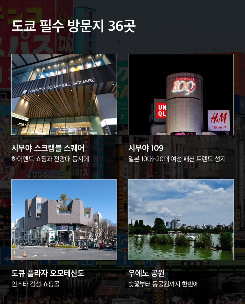 도쿄 여행을 계획 중이신가요? 수많은 명소 중 어디를 가야 할지 고민이라면, 도쿄의 랜드마크, 쇼핑, 맛집, 힐링 스팟을 모두 아우르는 필수 방문지 36곳을 엄선해 드립니다.