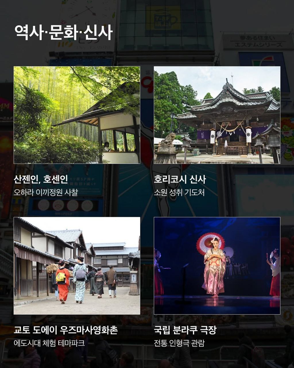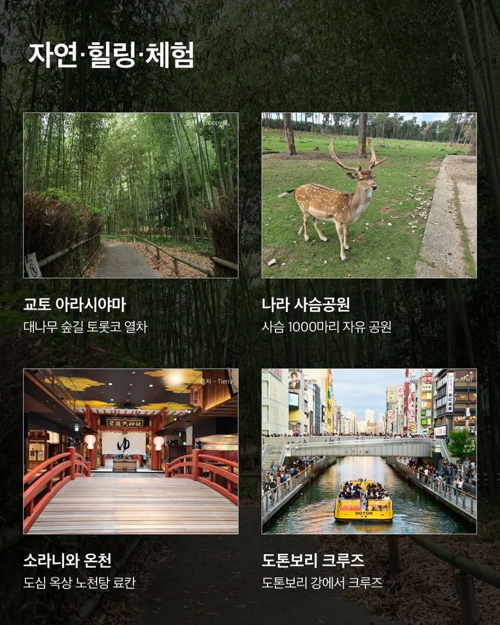 | 자연/체험 | 교토 아라시야마 | 대나무 숲길, 토롯코 열차 | 교토 아라시야마 |