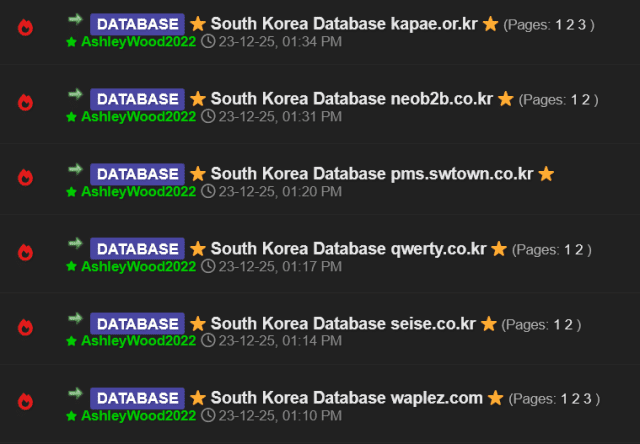- '애슐리우드2022(AshleyWood2022)'라는 닉네임의 해커가 국내 소규모 쇼핑몰, 교육기관 등 17개 웹사이트를 연쇄 해킹하여 탈취한 데이터베이스(DB)를 다크웹 '다크포럼스'에 판매 중.
