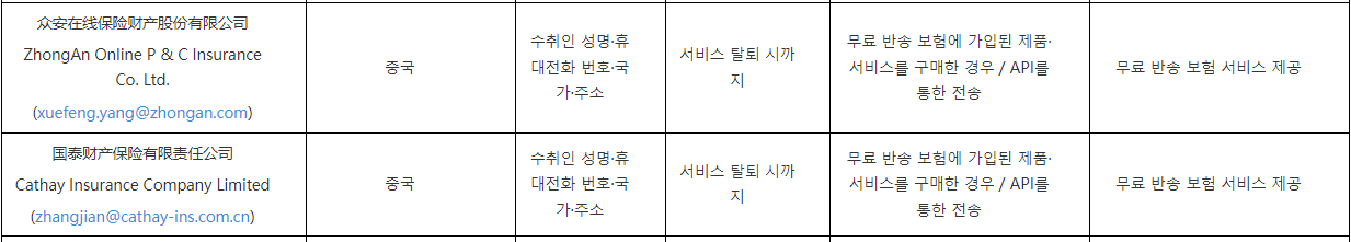 아래는 알리익스프레스 사이트의 개인정보처리방침에 게시된 정보 제공 업체이다. 본인은 인지를 못하겠지만 중국 보험사로 대한민국 국민의 정보가 넘어가고 있다.