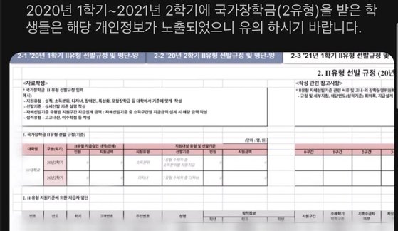 - 파일에 이름과 연락처, 학번뿐 아니라 주민등록번호, 학번, 학과와 국가장학금 지급자 선정에 필요한 소득분위, 기초생활보장 수급자 및 차상위계층 여부 포함